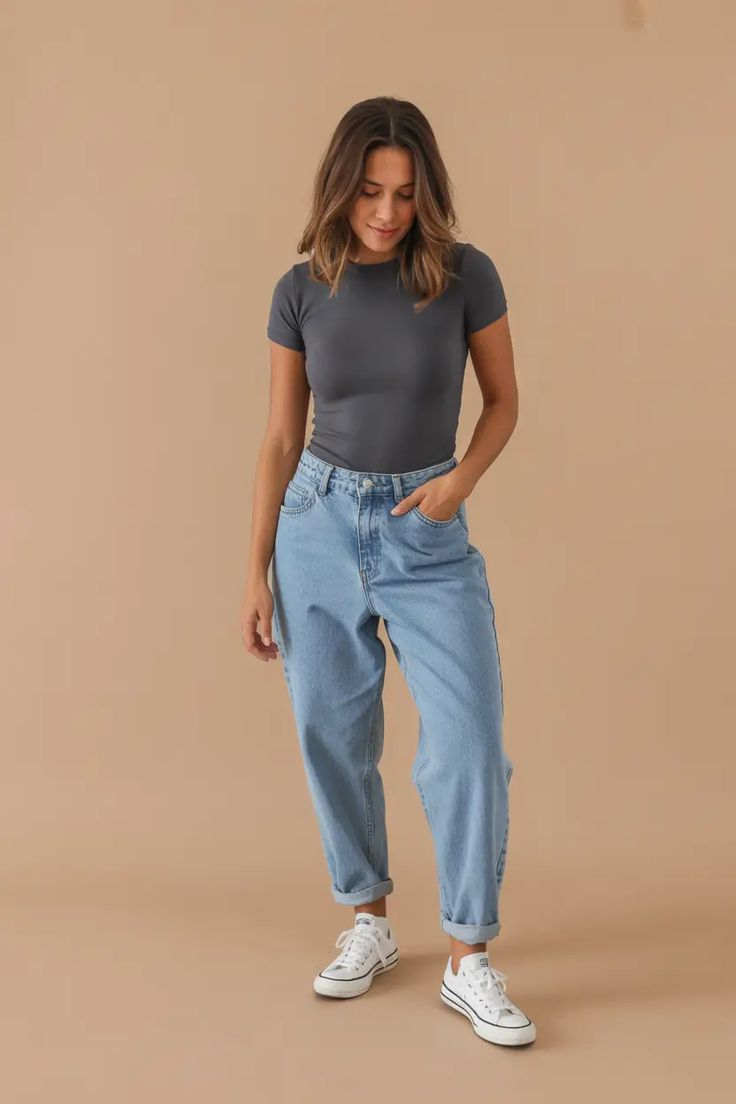 Comfortable mom fit jeans with a relaxed and trendy style.